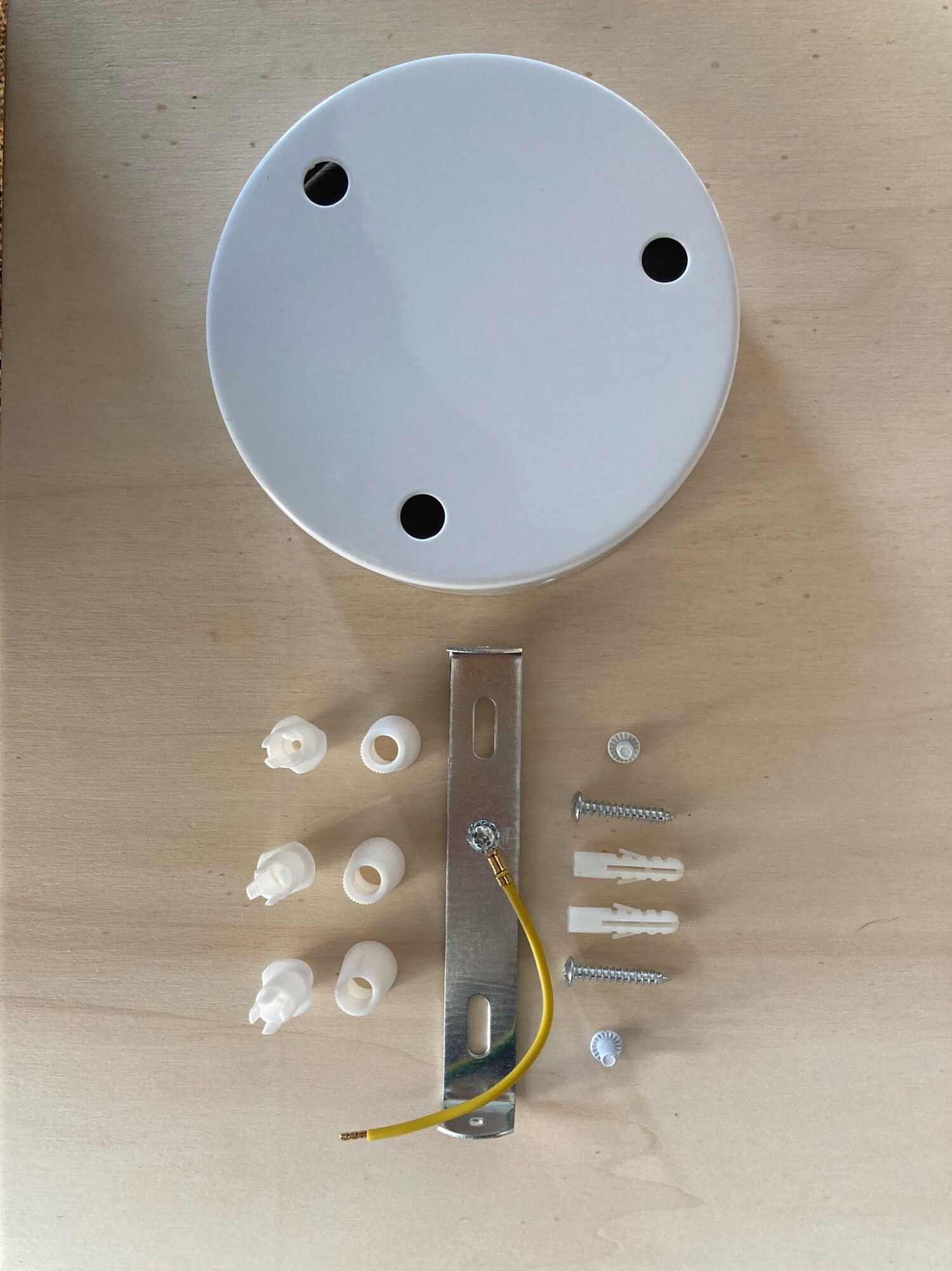 Plafondkap van wit metaal, inclusief bevestigingsmaterialen.